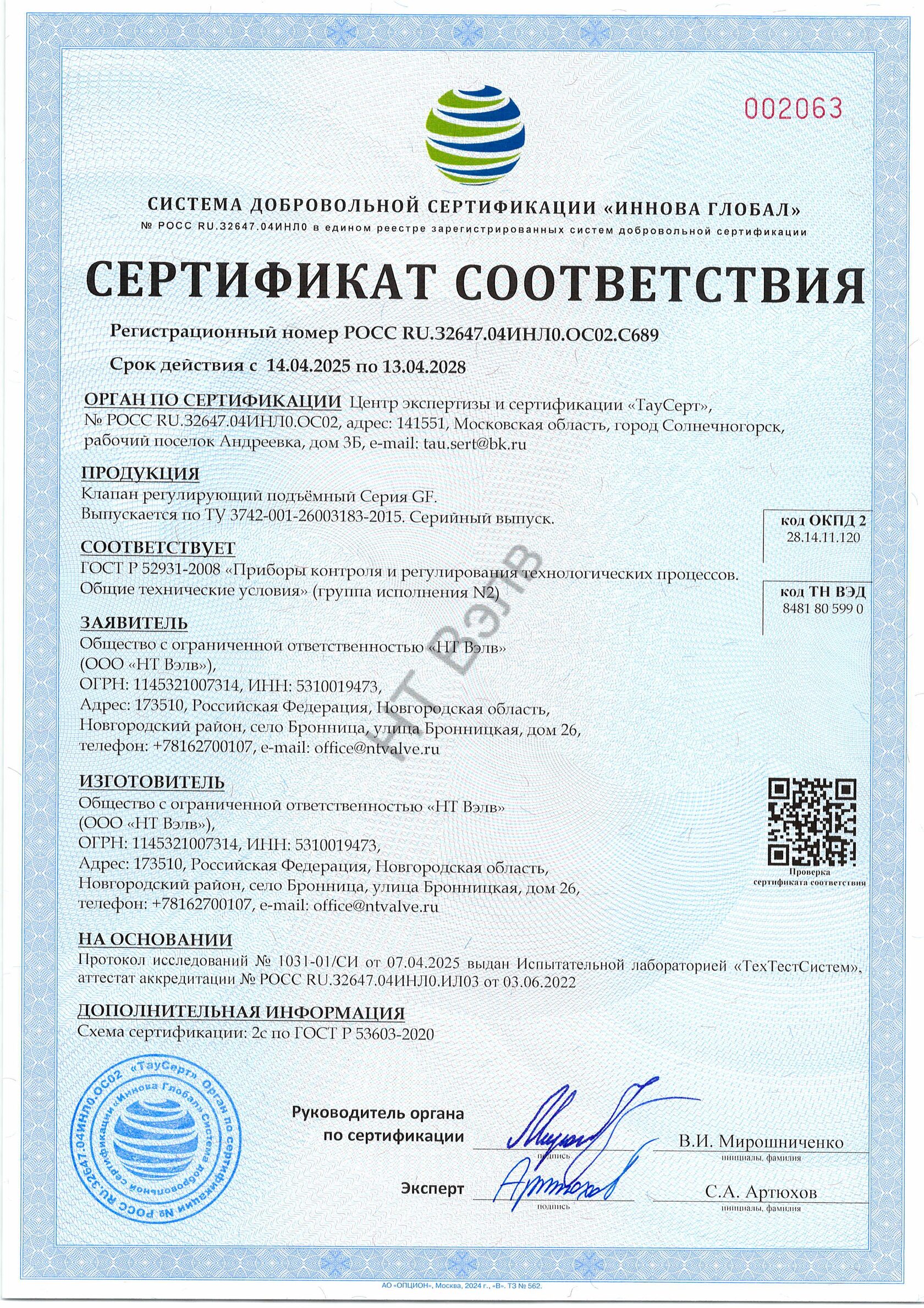 Сертификат соответствия ТР ТС 032 (НТКР, НТК, GF, VF)