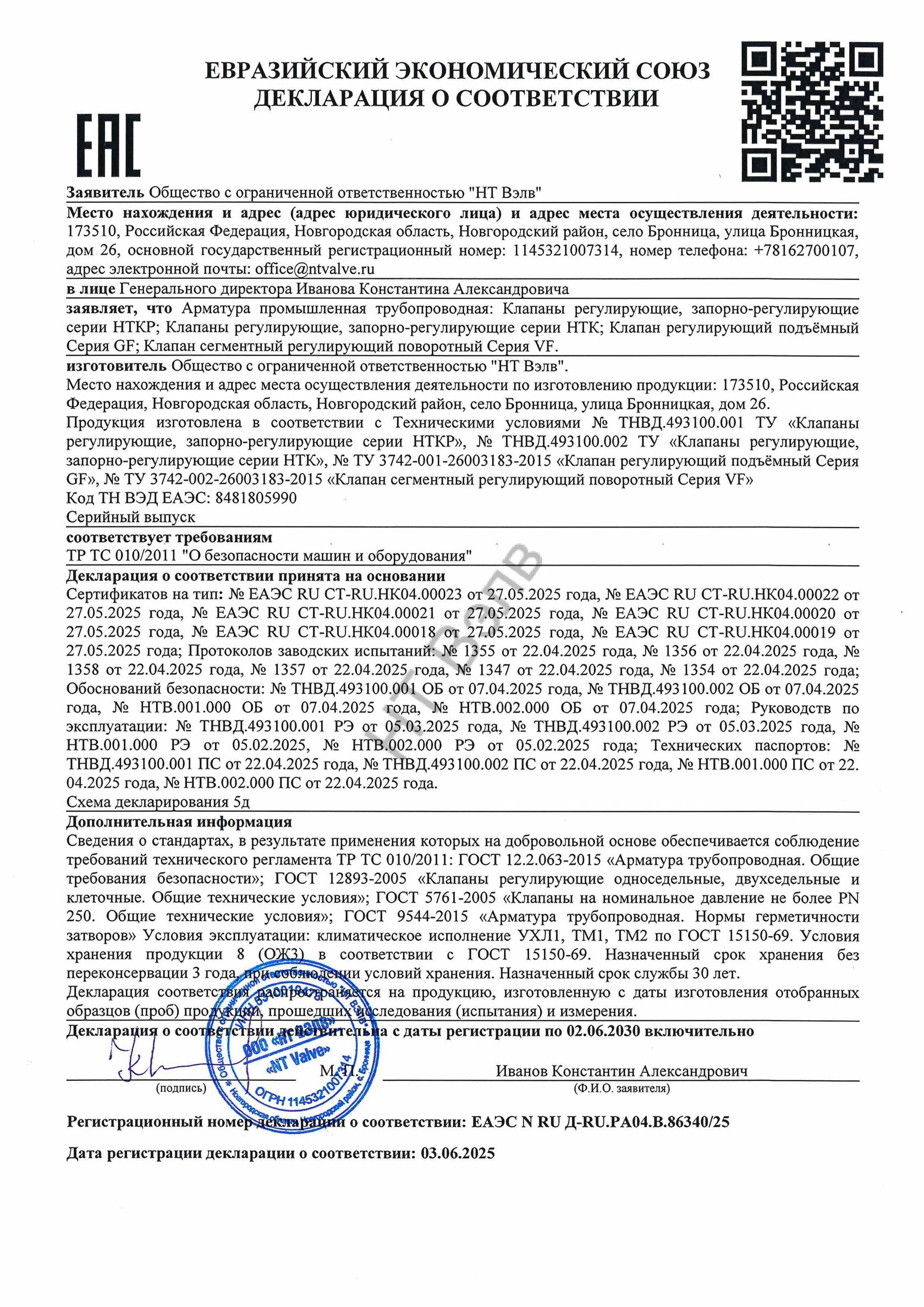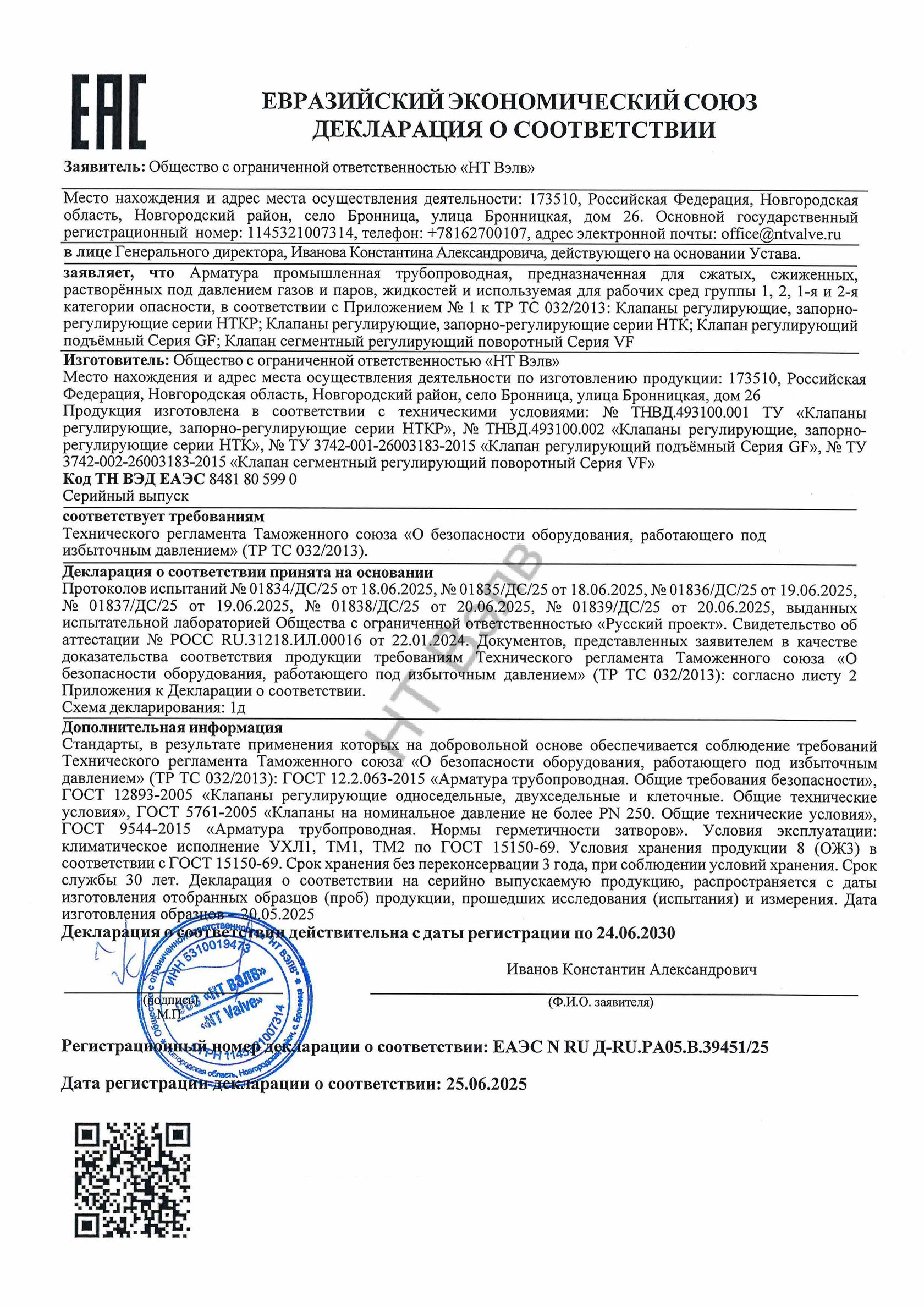 Декларация о соответствии ТР ТС 032 (НТКР, НТК, GF, VF)