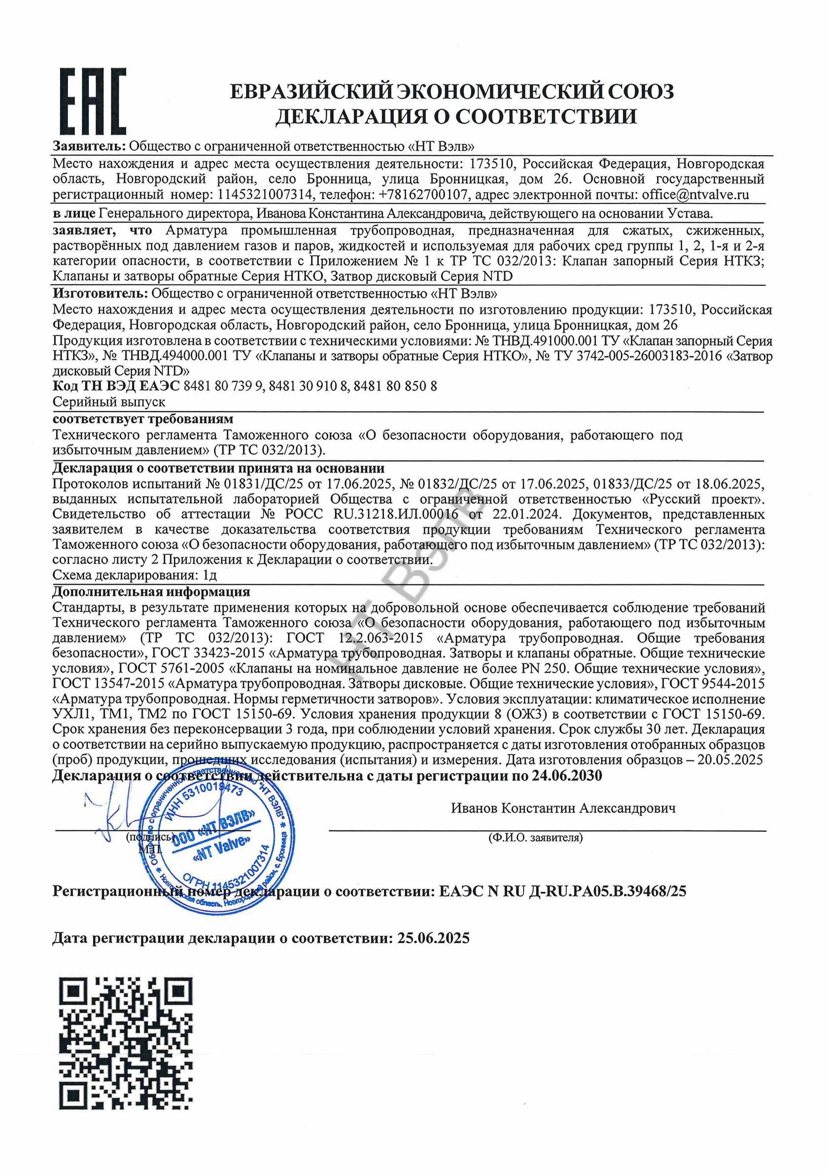 Декларация о соответствии ТР ТС 032 (НТКЗ, НТКО, NTD)