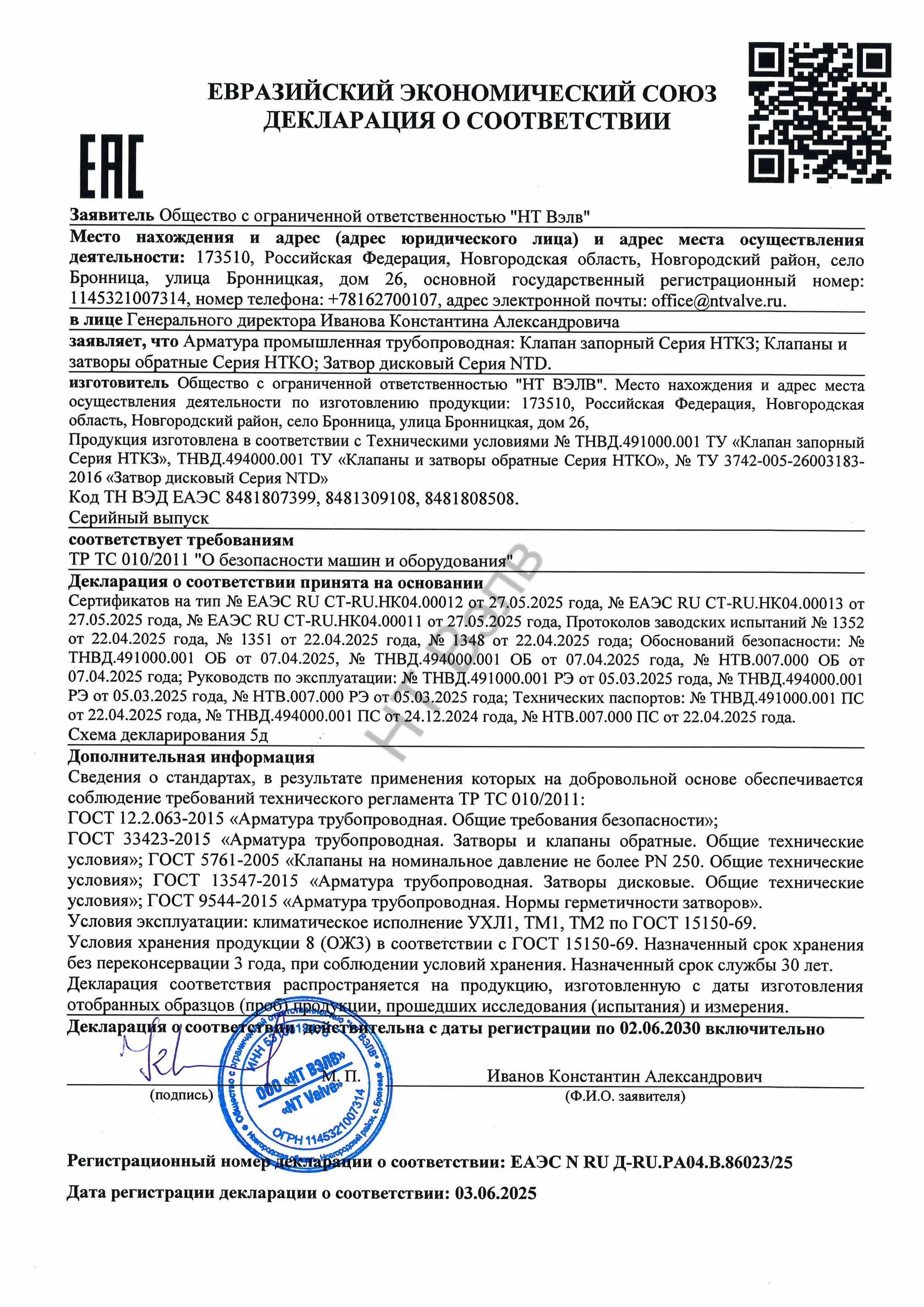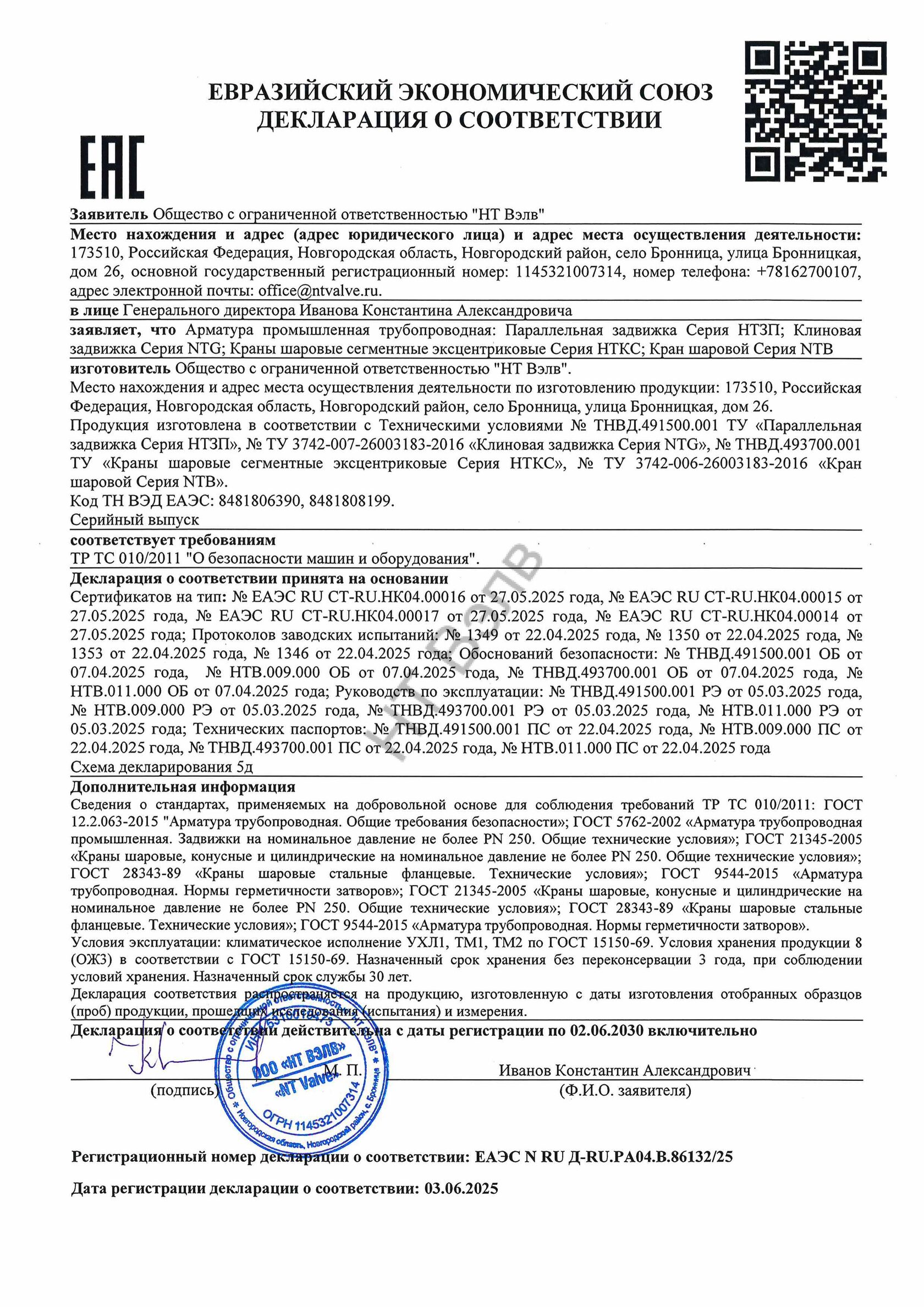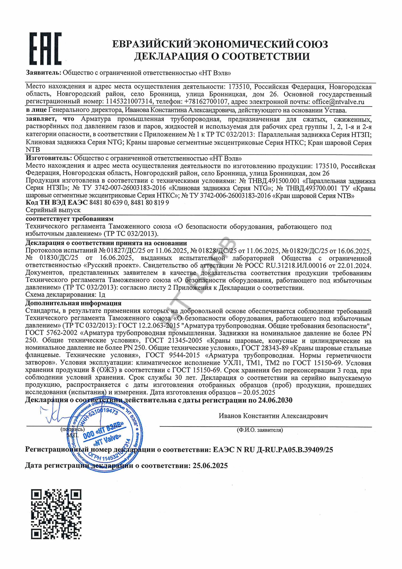 Декларация о соответствии ТР ТС 032 (НТЗП, NTG, НТКС, NTB)